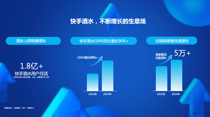 3月25日,在第112届全国糖酒商品交易会上,快手电商酒水行业也交出了2024年的“成绩单”。 平台数据显示,当前快手酒水用户月活超1.8亿(对酒水相关内容有观看、互动、搜索等行为人群)。2024年,快手酒水GMV同比增长超90%,动销商家数超5万。同时,过去一年,快手酒水新增10个破亿GMV品牌,近500个酒水自播商家GMV增长超100%。 当下,相比线下传统模式,短视频平台凭借强大的用户流量和“内容+电商”生态,已成为酒企突破线上增量的重要阵地。抖音、快手、小红书、B站等平台纷纷加速入局掘金;同时,酒企品牌们也亲自下场,争夺电商增量。 《每日经济新闻.将进酒》记者注意到,白酒品类依旧是快手酒水行业的“主力军”。数据显示,在快手酒水行业,白酒品类GMV占比高达80%。从酒水用户画像来看,男性用户是快手酒水行业的绝对消费主力,人群以二三线城市用户为主,新线用户占比优于其他平台,未来仍具备很大增长潜力。 例如,洋河品牌2024年实现年GMV超4倍同比增长,其中洋河超品日GMV超1.4亿,平均客单价高达700元,较历史活动周期均有翻倍增长。而中小商家“酒小弟”则在快手实现年GMV超3000万。
